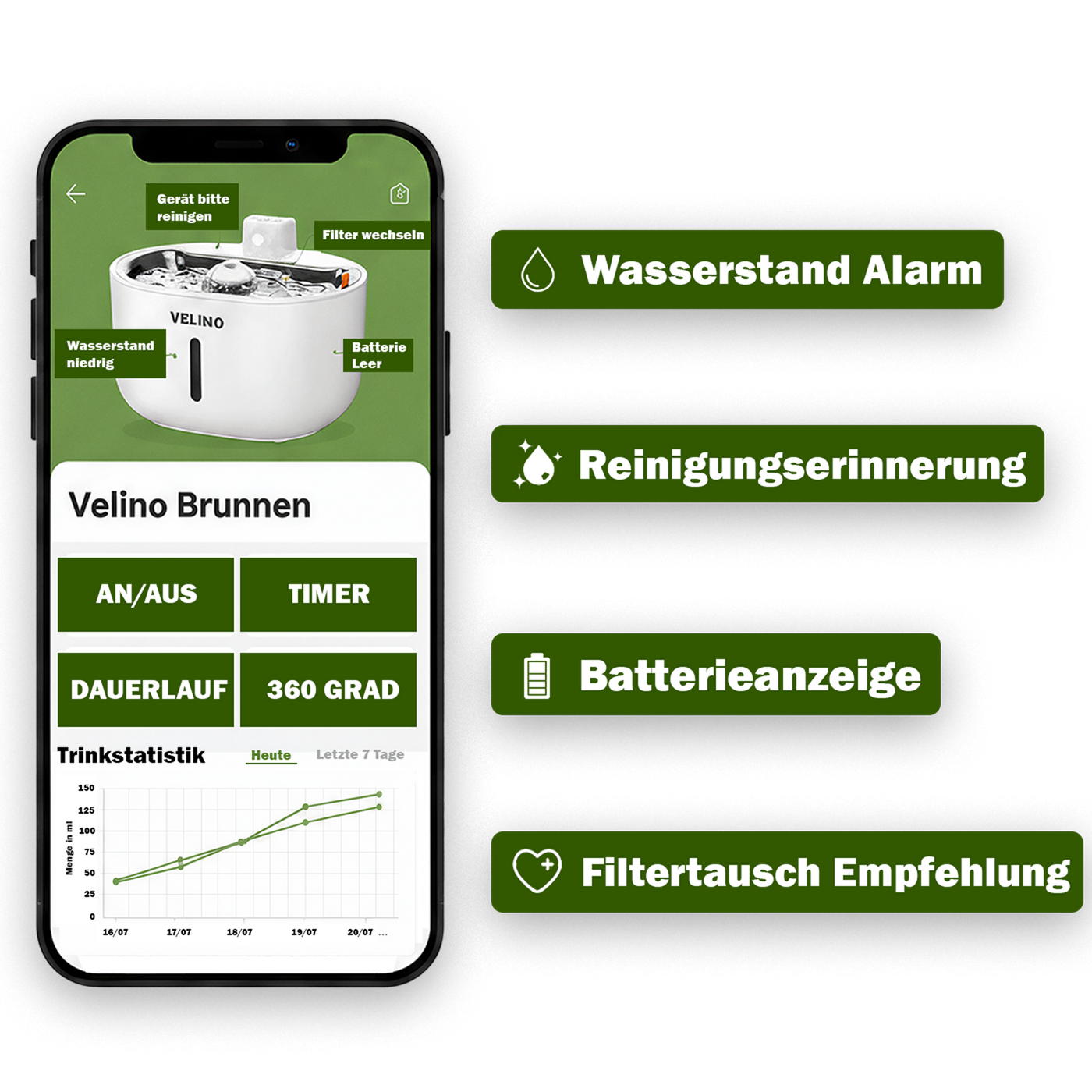Die Velino App synchronisiert deinen Brunnen live und erinnert dich smart: Wasserstand niedrig, Reinigung fällig, Strom/Netzteil prüfen, Filter wechseln. Dazu klare Trinkstatistiken & Trends – so weißt du, dass alles läuft. Alles im Griff: jederzeit, von überall!