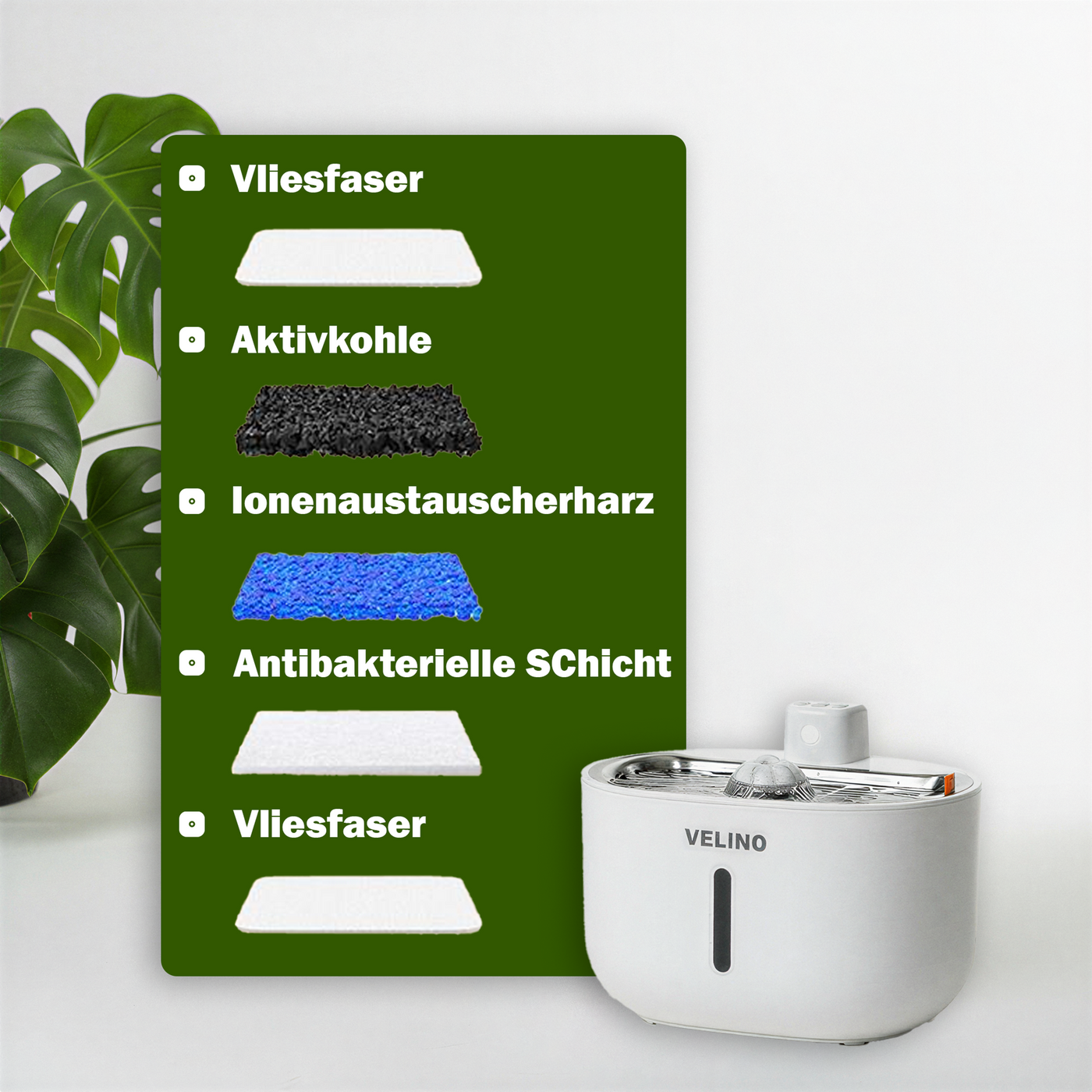 Velino reinigt in 5 Stufen – für frischen Geschmack und weniger Ablagerungen: Vlies (fängt Haare & Partikel), Aktivkohle (bindet Gerüche & Chlor), Ionenaustauschharz (reduziert Kalk & Metalle), antibakterielle Lage (hemmt Keimwachstum) und Feinvlies (Final-Polish). Ergebnis: sauber, sanft, katzenfreundlich.