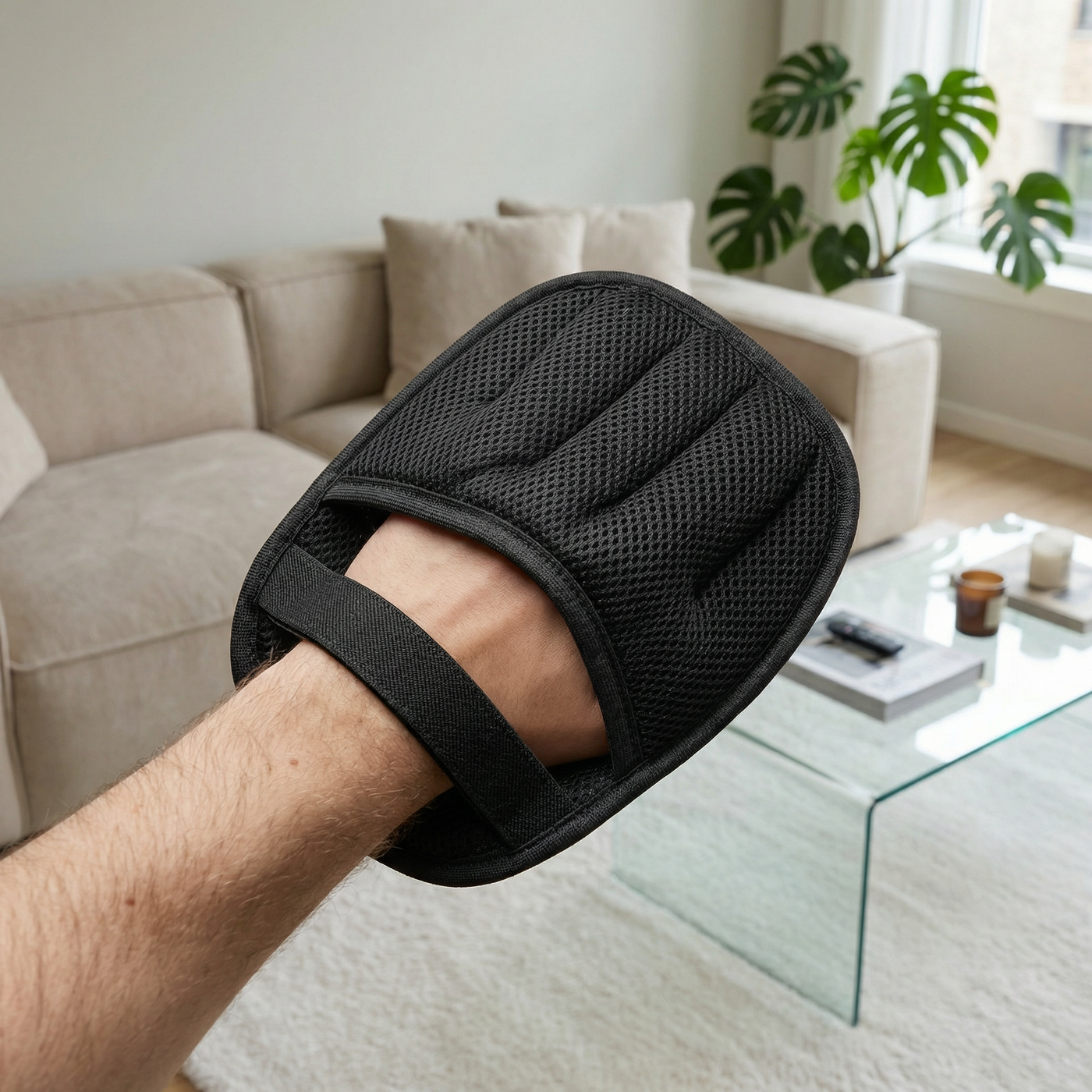 Der Handschuh arbeitet mit einem weichen, verdickten 3D-Mesh, das Haare löst, ohne den Stoff unnötig zu stressen.
